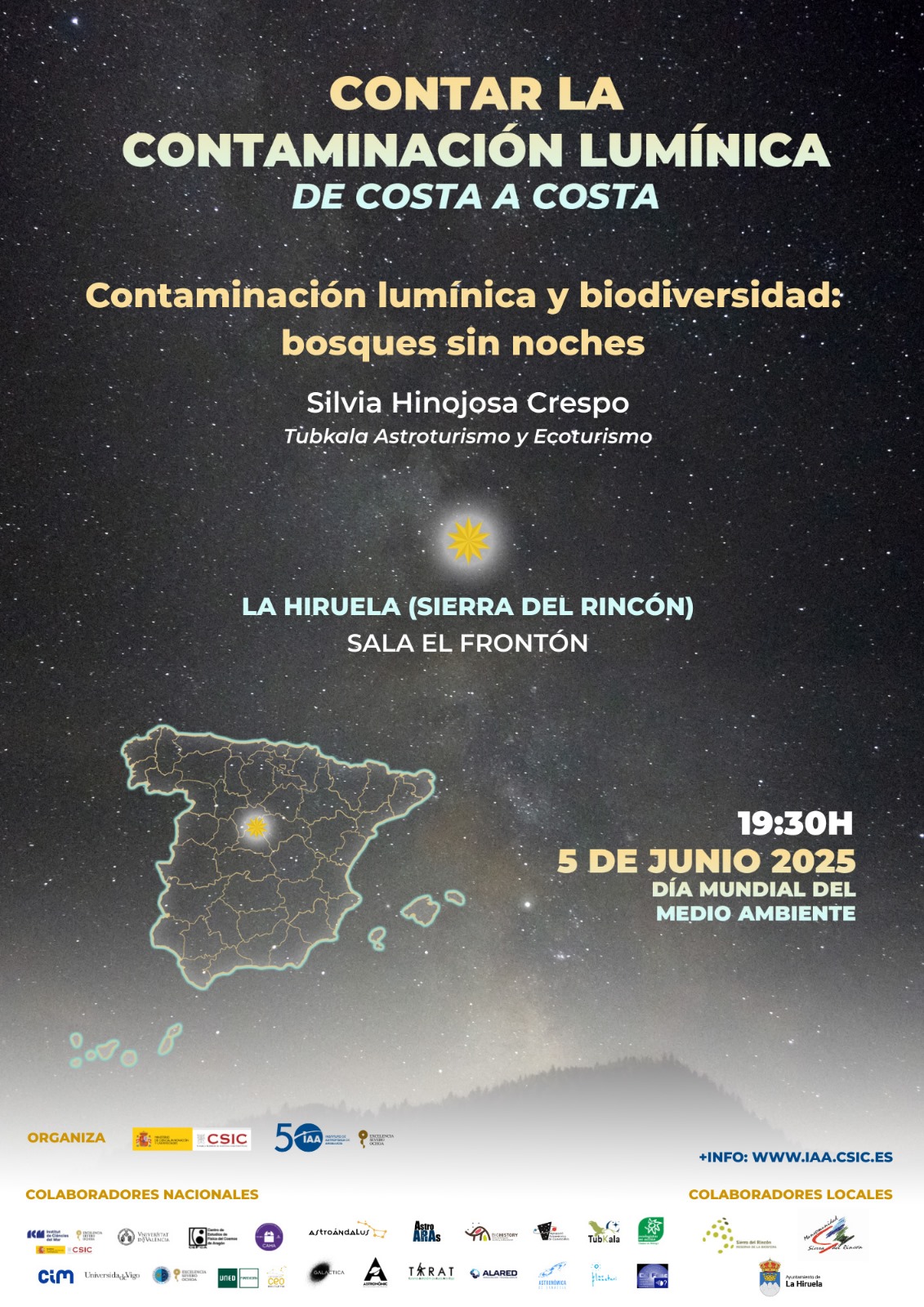 Descripción: Charla divulgativa incluida en el ciclo “Contar la contaminación lumínica de costa a costa”, organizada por el CSIC en el marco del 50 aniversario del Instituto de Astrofísica de Andalucía. Bajo el título “Contaminación lumínica y biodiversidad: bosques sin noches”, la sesión abordará los efectos de la luz artificial nocturna sobre los ecosistemas, con especial atención a los espacios naturales como la Sierra del Rincón.