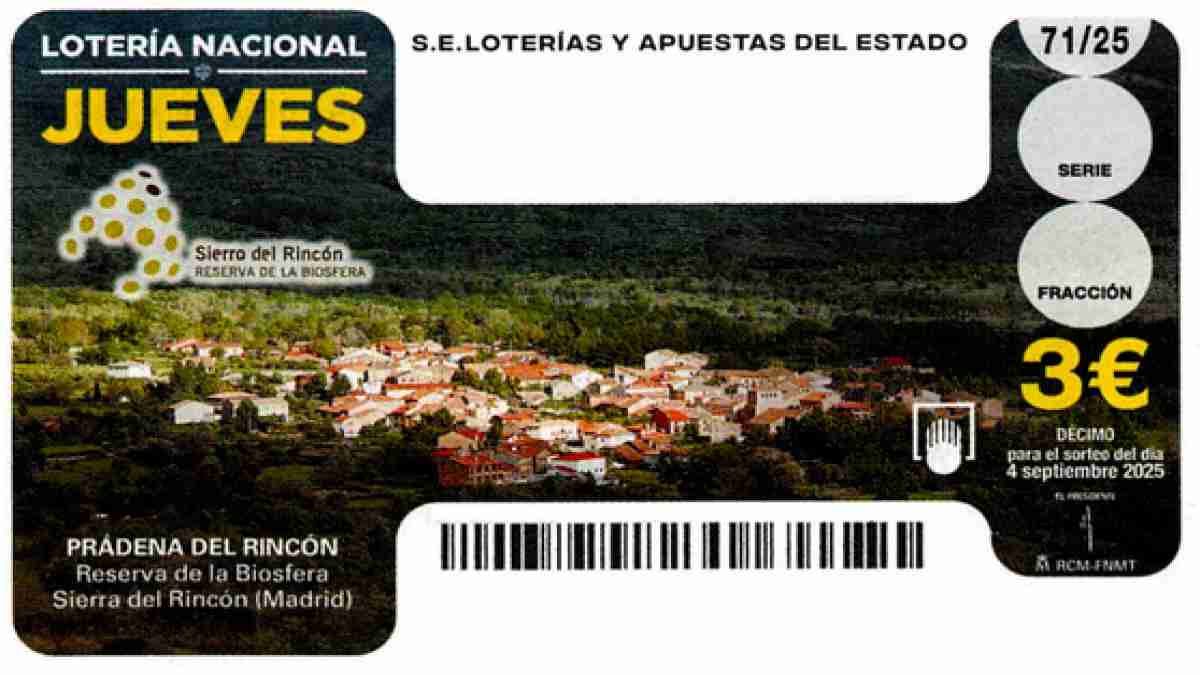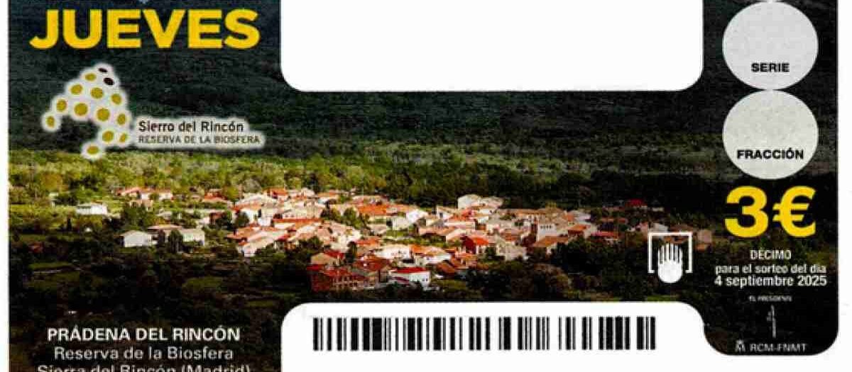 17 agosto 2025 Prádena del Rincón en los décimos de la lotería nacional Los décimos de lotería del próximo 4 de septiembre han sido dedicados a Prádena del Rincón y a la Reserva de la Biosfera. Os deseamos mucha suerte a todos los que participéis.