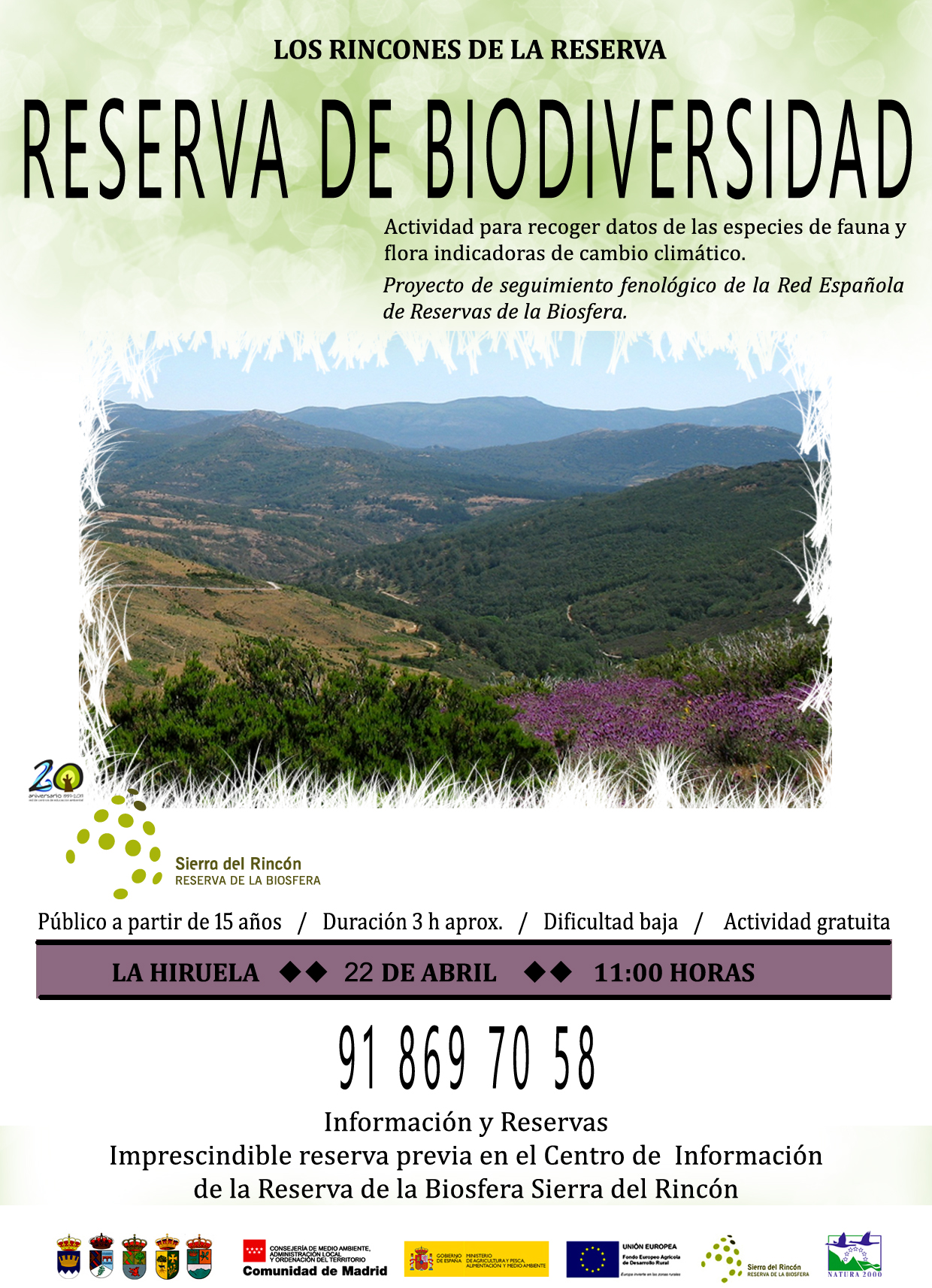 La actividad “Reserva de Biodiversidad” organizada por el Programa de la Reserva de la Biosfera Sierra del Rincón tendrá lugar en La HIRUELA el próximo sábado 22 de abril a las 11 horas.